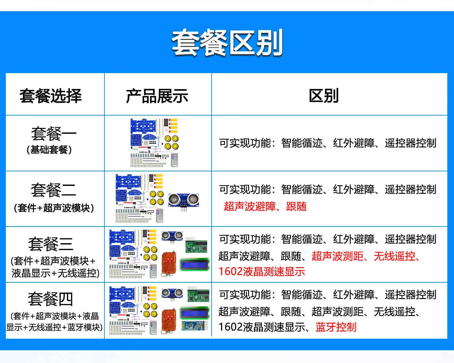 套餐四(套件+超声波模块+液晶屏+无线遥控+蓝牙模块)