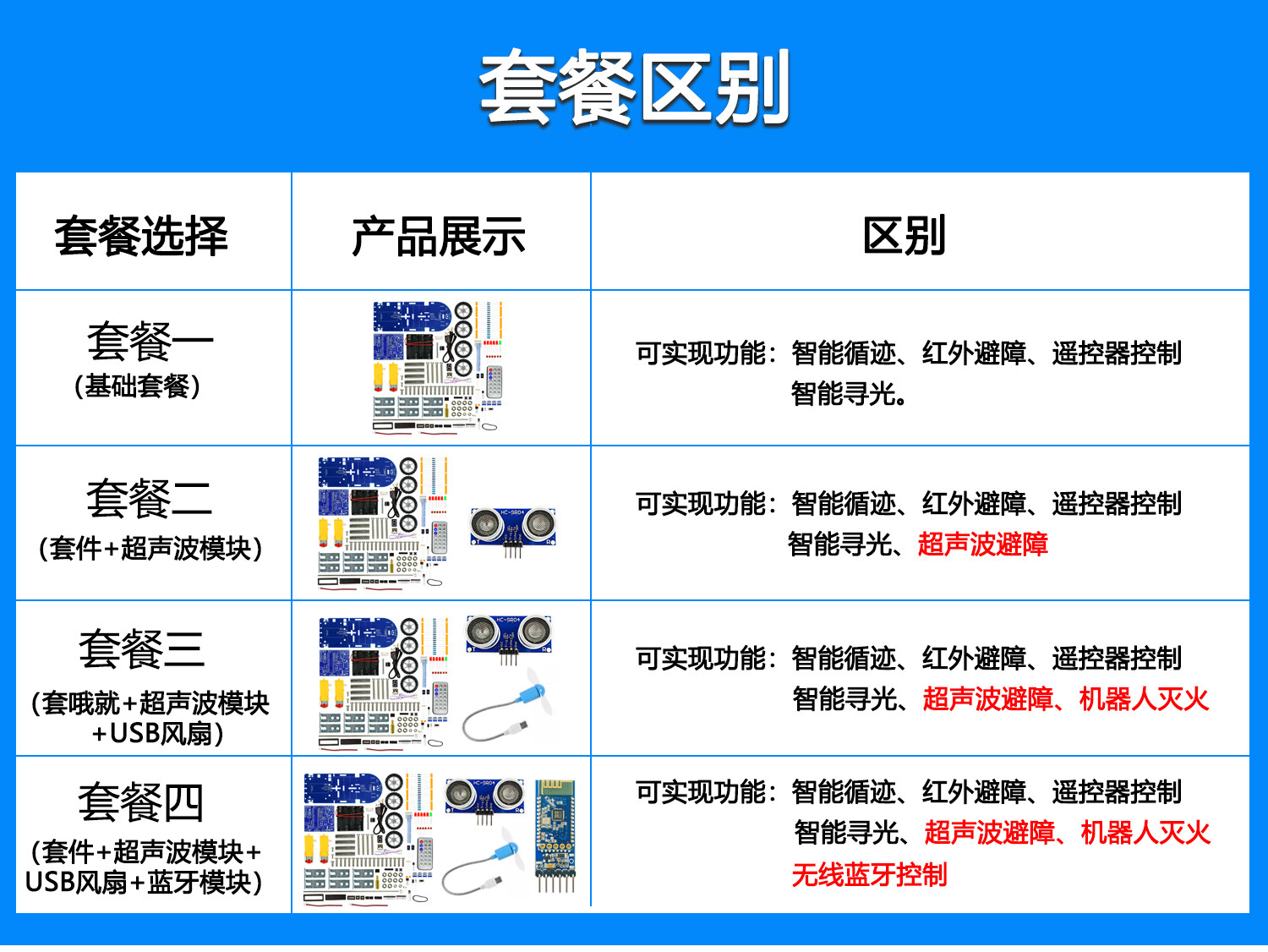 套餐四(套件+超声波模块+风扇+蓝牙模块)