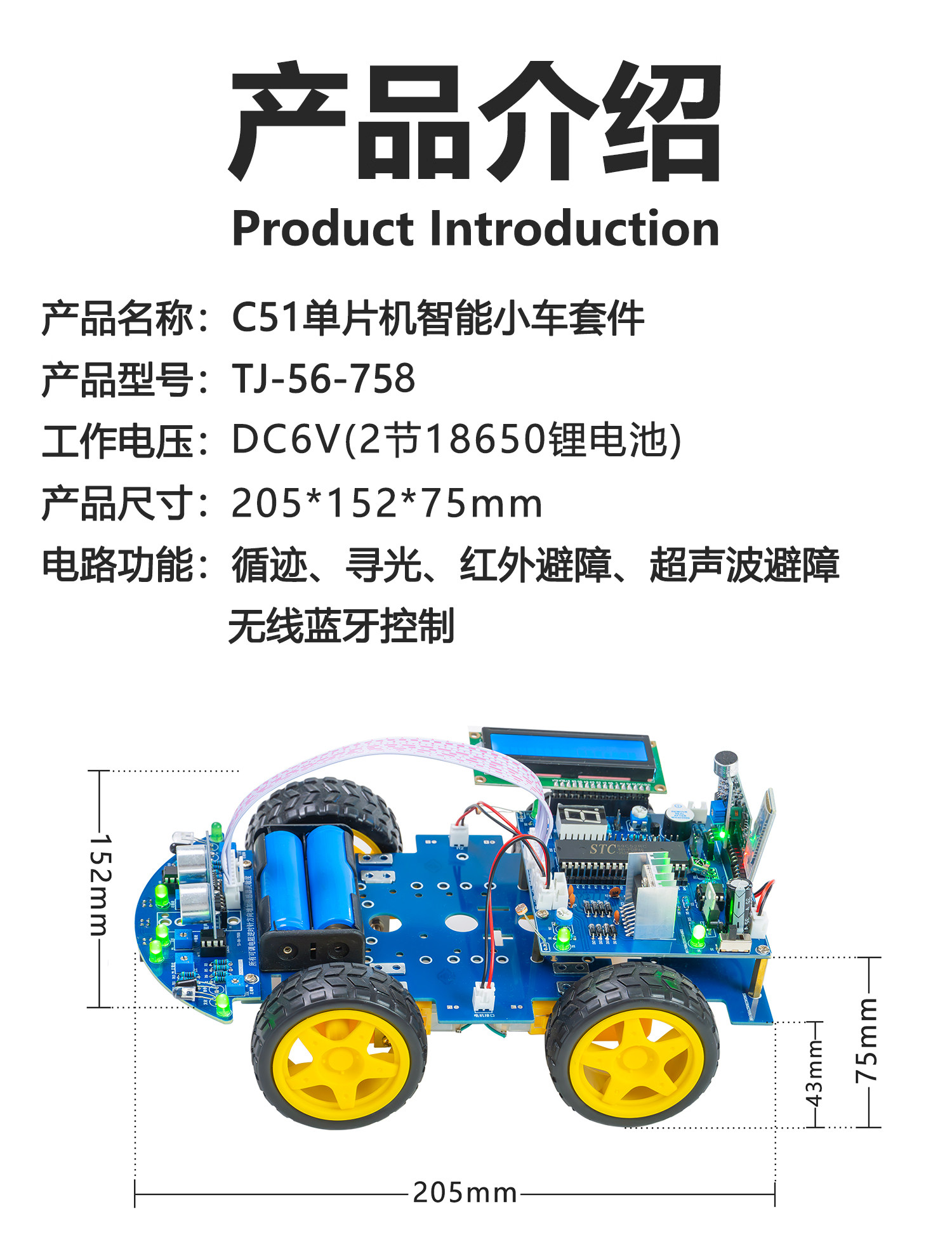 单片机智能车套件红外循迹避障**声波测距无线遥控蓝牙TJ-56-758