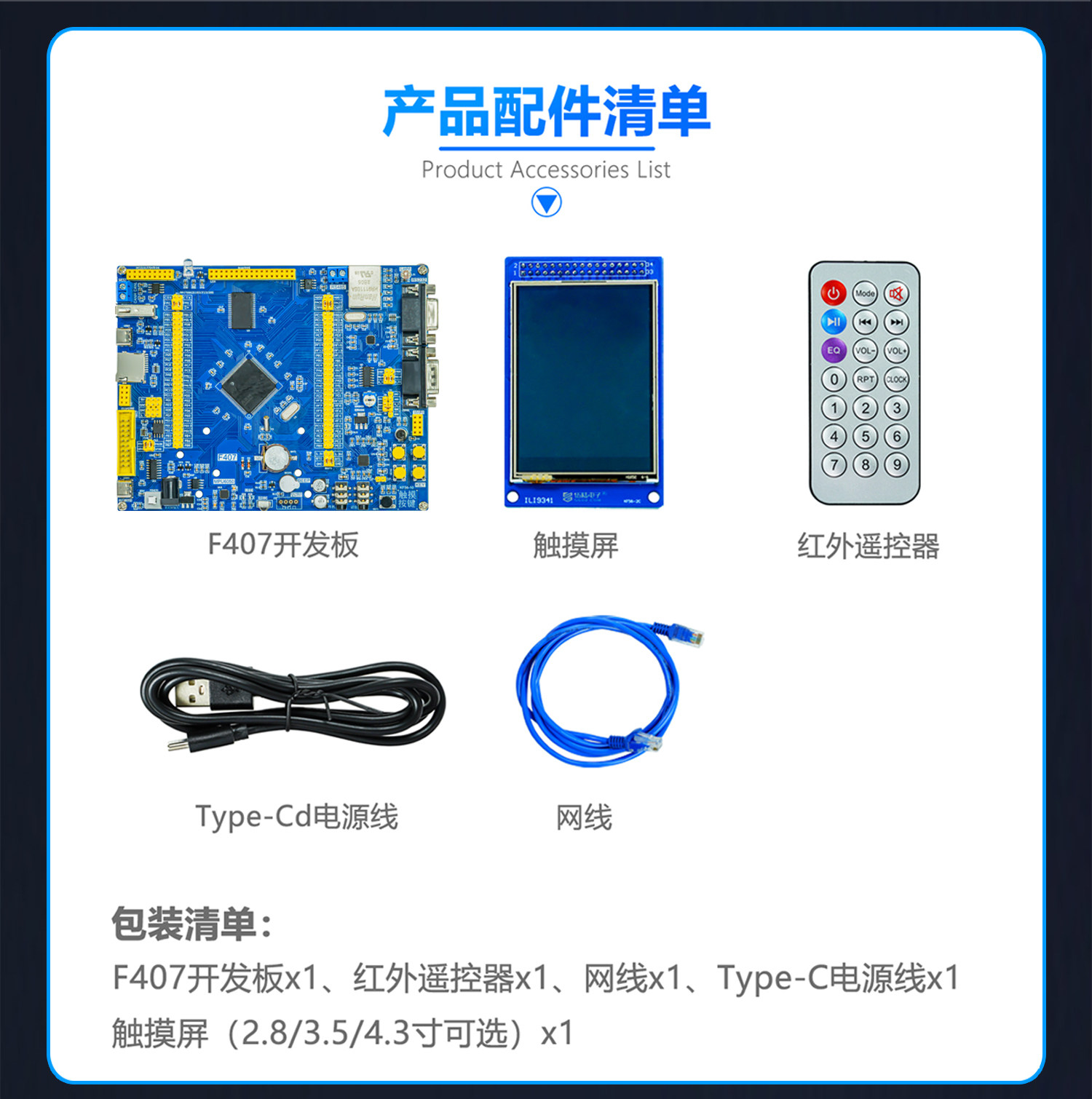基础(开发板+屏幕+电源线+遥控器+网线)